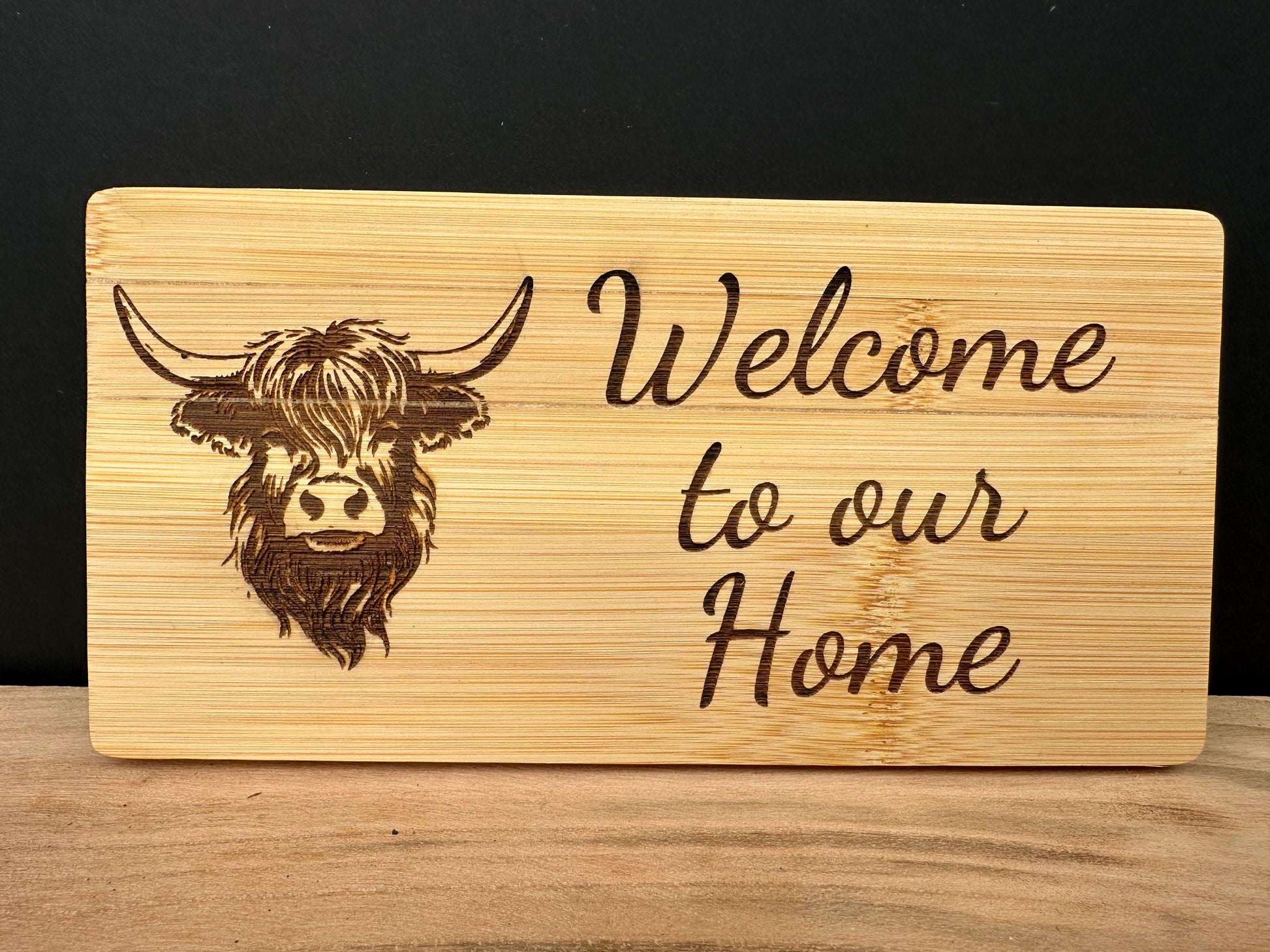 This beautifully crafted bamboo welcome sign features a charming highland cow design. Made from sustainable bamboo, this sign adds a touch of warmth and personality to any home. Show your guests a warm welcome with this unique and eco-friendly sign.